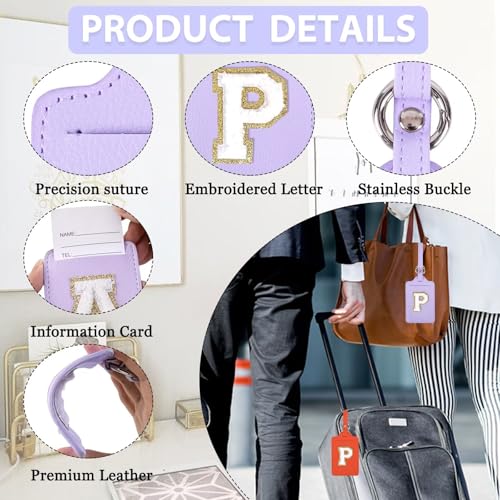 Personalized Initial Luggage Tags for Suitcases, Leather Chenille Letter Cute Luggage Tags with Privacy Name Card, Embroidered Travel Bag Backpack Tag Gifts for Women Kids Girls Teens(Purple-P)