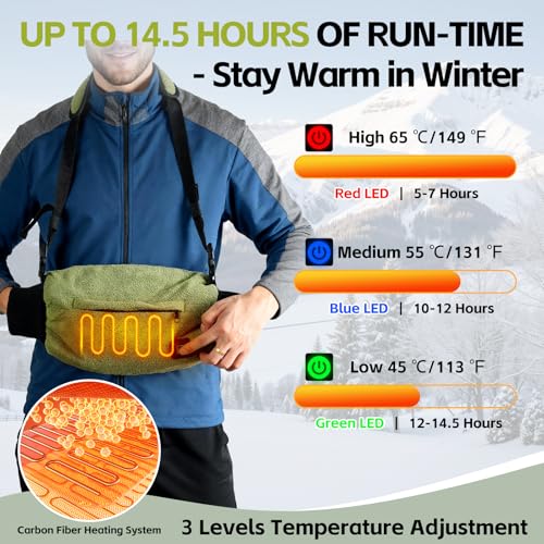 • 3-Temp Heated Hand Warmer Pouch: Ideal for hand warmer and hand warmers enthusiasts. Select low (green 45 ℃/113 ℉), medium (blue 55 ℃/131 ℉), or high (red 65 ℃/149 ℉) heat via button. Comes with a 10000mAh power bank, offering 1.5 – 3.5 hours of adjustable warmth during extended deer hunting. FCC/CE – certified with safety protection, a top choice among heated hand warmer pouch options.