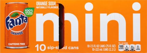 - 10 pack, 7.5 fl oz mini cans of Fanta Orange Soda soft drinks in a fridge pack for lip-smacking deliciousness in every vibrant sip