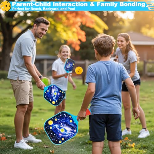 - All-in-One Outdoor Adventure Set: Turn any spot into a playground with this portable kids pickleball set, including 2 paddles, 2 balls, and a carry net bag. Ideal for beach games, pool toys, yard games, or camping essentials, it encourages hand-eye coordination and family bonding through active pickleball games—perfect for creating cherished outdoor memories together