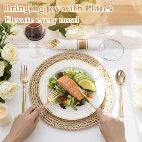 WDF Partyware 350Piece Gold Dinnerware Set for 50 Guests – Gold Plastic Plates with Disposable Cutlery Include:50Dinner Plates-50Dessert Plates-50Pre Rolled Napkins with Silverware for Wedding