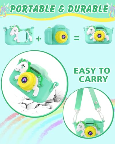 - The unicorn is a removable cover to the kids camera giving two different looks. Soft bumper case is great for absorbing knocks, bumps and inevitable drops. Rechargeable kids video camera has a lanyard so they can carry it