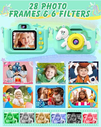 - This children camera includes 28 funny photo frames, 6 color filters, and 10 mirror effects, allowing kids to add creativity and fun to their photos. The 4x digital zoom, self-timer, and time-lapse shooting features provide different perspectives and options for capturing unique shots. Additionally, 5 built-in games (Snake, Box push, ect.) help to cultivate kids reactive thinking