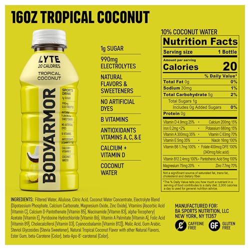 BODYARMOR LYTE, Tropical Coconut, Electrolyte Drink, 20 Calories, 16 Fl Oz Bottles (12 Pack), Coconut Water Sports Drink, Natural Flavor & B Vitamins