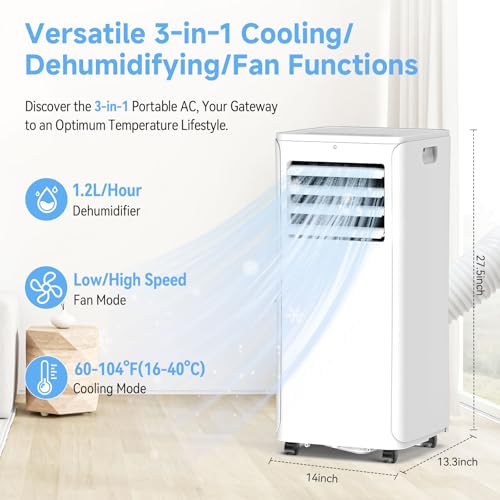 - Versatile 3-in-1: Take your comfort to new heights with our 3-in-1 portable air conditioner (5100 BTU SACC / 12000 BTU ASHRAE). It combines cooling, dehumidifying, and fan functions. The adjustable fan speed and automatic air swing allow for precise temperature control, cooling the room to a range of 61 – 88°F. The user-friendly LED control panel and remote control make operation a breeze. What's more, it features an automatic restart function after a power outage, ensuring uninterrupted comfort. Experience all-round climate control and create a cool and pleasant living space.