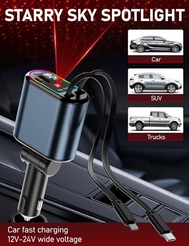 • I. MULTI-DEVICE CHARGING: The LWW 4-in-1 Retractable Starlight Car Charger with 2 USB ports (USB A+C) and 2 retractable cables (USB C+L) allows you to charge multiple devices at the same time. It makes an excellent car accessory, perfect for smartphones and a stylish gift for drivers. This charger ensures fast and efficient charging while helping to keep your car or truck neat and organized.