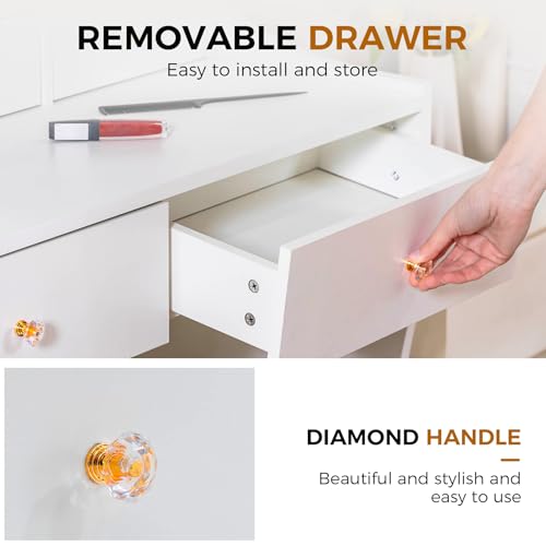 COMHOMA Makeup Vanity Desk with Mirror and Lights, Vanity Table and Chair Set with 5 Drawers and Charging Station, Bedroom Dresser LED Mirror Stepless Dimmable & 3 Color Modes Adjustable, Pure White
