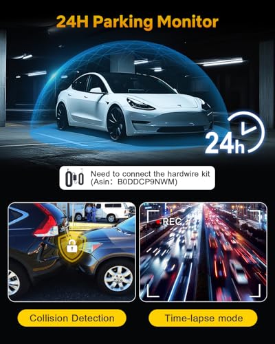- 【24h Parking Monitoring】When using the hardwire kit, the dashcam can realize 24-hour parking monitoring. There are two parking modes: the 24-hour time-lapse mode records videos continuously, allowing the entire parking process to be captured. The G-Sensor parking mode locks and records videos if a strong impact is detected by the car camera.Please note that the hardwire kit is not included in the package, please contact us to obtain it.