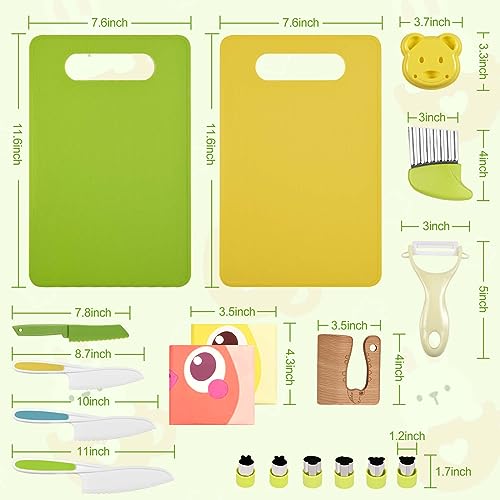 - [π΄πππ πππππ π°ππππ πππ π²ππ π] – This toddler kids kitchen set knife toy are perfect for teaching children basic kitchen skills during play. With 4 nylon toddler knives, crinkle cutter, 2 cutting boards, Y-peeler, kids wooden knife, 6 sandwich cutters, 1 bear-shaped mold, 2 cartoon apron, your child can safely practice cutting a variety of foods like fruits, cakes, and salads.