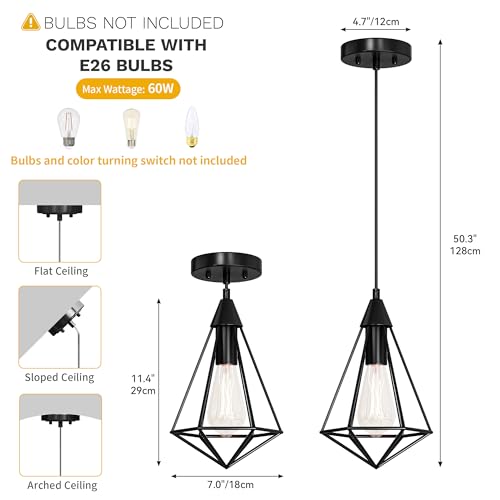 DWVO 2-Pack Pendant Lights Fixture, Farmhouse Iron Cage Metal Line Hanging Ceiling Light with E26 Lamp Holder, Suitable for Kitchen Island, Entrance, Dining Room, Hallway (Black)