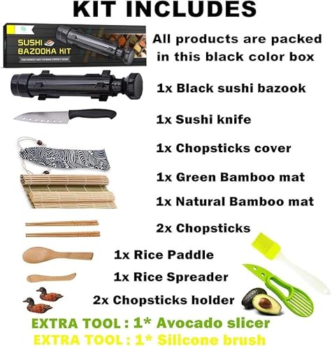 - ✔️ ALL-IN-ONE SUSHI MAKER KIT: Transform your kitchen into a Japanese sushi bar with our all-in-one sushi making kit! This comprehensive set includes everything you need: a sushi bazooka, bamboo sushi mat, sushi roller, musubi press mold, and even a sushi knife for perfect cuts. With additional tools like a rice paddle, avocado saver, cucumber slicer thin, and various rice molds for kids, this kit makes sushi-making a fun and easy experience.