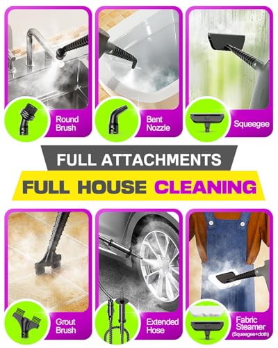 • [COST-EFFECTIVE WITH 12 ATTACHMENTS] The steam cleaner handheld equips with 2*round brush, 2* grout brush, 1*Cone nozzle, 1* bent nozzle, 1*scraper, 1* extension hose and nozzle, 1*squeegee, 2* cloth pad, 1*measuring cup. Handheld steamer for cleaning effortlessly tackle kitchen counters, stovetops, sinks, bathroom, toilet, bed, windows, walls, floors, tiles, sofas, mattresses, upholstery, household blinds and even car interiors—all with one powerful steam cleaner for home