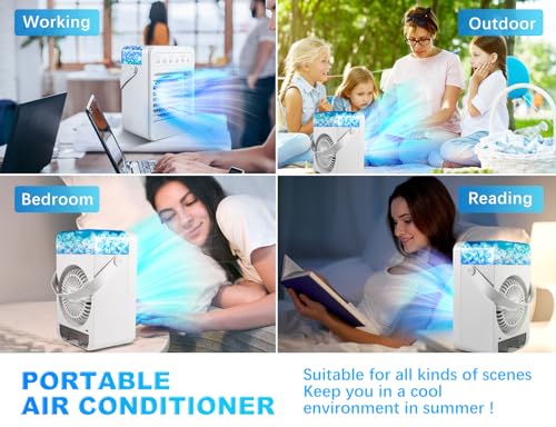 - 【4 in 1 Fast-Cooling Mini Air Conditioner Fan】 The 4-in-1 portable air conditioners are a combination of micro air conditioner and humidifier, which integrates bench fan, air conditioner, humidifier and LED environmental light. The humidification function helps to avoid dryness in hot summer days. Driveaway the heat for you and accompany you to spend a cool summer