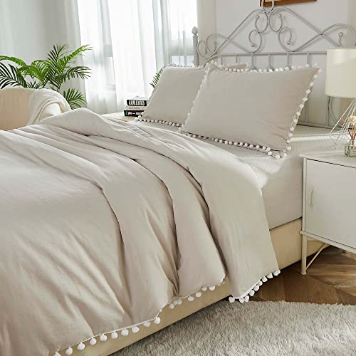 - 【Design】Beige Grey color. Decorate with pure White pom poms. Suitable for most occasions, supports sleeping naked, and can also be used as a bed sheet.The Zipper Closure is easy for you to put your comforter in and out and 4 corner ties to help hold your comforter ,Envelope pillowcases of the same style, so you don’t have to worry about matching them.Please kindly note this bedding set DOESN'T include any comforter or filling. This Set dosen't include any Bed sheets.