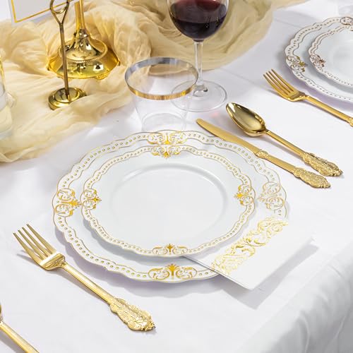 Ciaell 175 PCS White and Gold Plastic Plates – Fancy Gold Disposable Dinnerware Set with of 50 Plastic Plates, 25 Knives, 25 Forks, 25 Spoons, 25 Cups, 25 Napkins for Wedding, Party