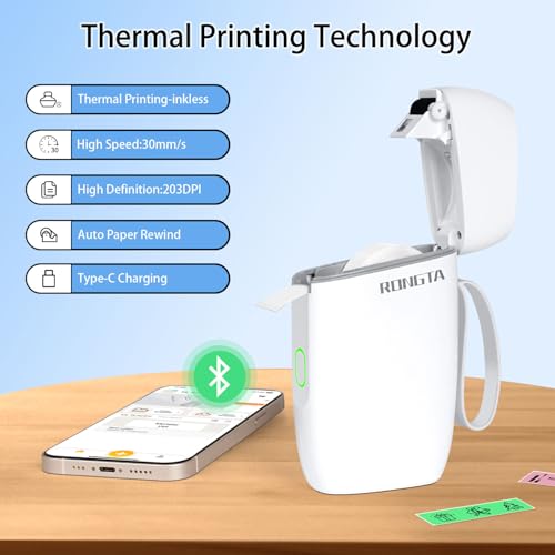- Thermal Label Printer with High-quality Printing: Rongta R5 Portable Thermal Label Printer Label Makers with BPA-Free Direct Thermal Technology. Sticker Label Maker is Equipped with high-speed chips and 203 DPI, you can enjoy high-definition by inkless. Label maker built in durable rechargeable battery, which can work for a long time. Mini bluetooth label maker is thermal technology printing only prints black and white. We also have colored label supply, can make the printing more joyful.Smart Mini Label Maker for Travel USB Rechargeable,Tag Printer bring you fun and convenience,cool gadgets to make life easier(Note: Not including charging adapter, not suitable for fast charging adapter)