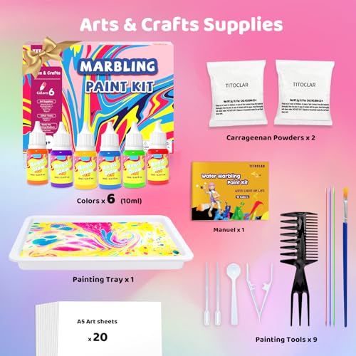 - 【Magic water marbling paint】 Instead of painting on paper or canvas, try painting on… water! It includes 6 colors of paint (16ml each), 20 sheets of paper, 3 needles, a pipette, spreader, measuring spoon, tray, and manual. Perfect birthday gifts ideas for girls.lets Kids create dazzling artwork in a completely new way!
