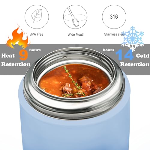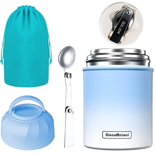 CocoMeiwei Soup Thermo for Hot Food & Drinks, Thermo Lunch Box for Kids, 17oz Vacuum Insulated Food Container with Spoon&&Drawstring Bag, Soup Therm for Adults, Blue&White