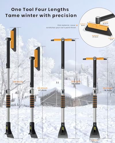 helloleiboo 43.7" Extendable Ice Scrapers for Car Windshield for 12 Adjustable Length Settings with Foam Grip and 360° Pivoting Brush Head Detachable Snow Brush for Truck SUV(Orange)