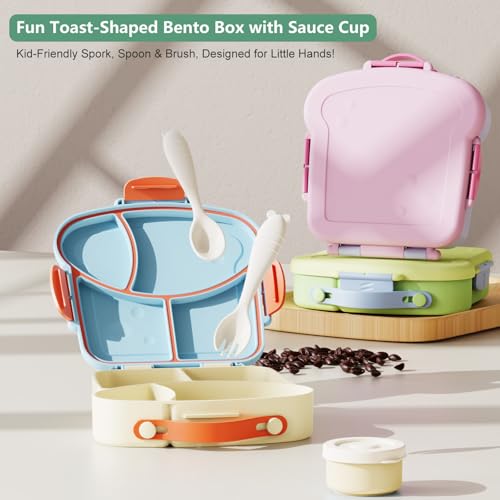 SAYAPE Bento Lunch Box for Kids – Toast-Shaped 4-Compartment Lunchable Food Container with Sauce Cup, Utensils & Brush, BPA-Free, Reusable Snack Container with lid, Ideal for School & Travel – Purple