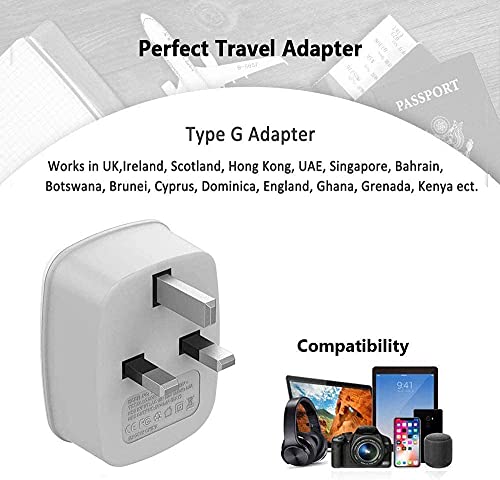 This UK travel plug adapter compatible in most overseas countries such as UK, Ireland, Dubai, Scotland, Hong Kong, Bahrain, Belize, Botswana, Brunei, Cyprus, Dominica, England, Ghana, Gibraltar, Grenada, Iraq, Kenya, Macau, Malaysia, Nigeria, Nothern Oman, Qatar, Saint Vincent, Saudi Arabia, Singapore, Sri Lanka, Uganda, the UAE, Yemen and ect