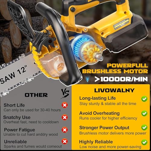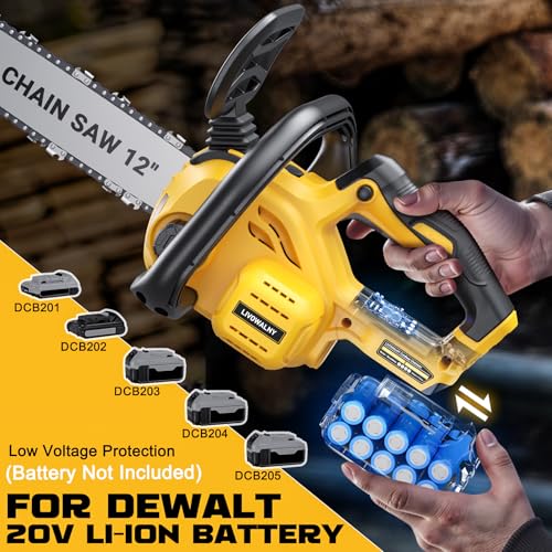 - 【Compatibility with DeWalt 20V】This LIVOWALNY chainsaw (tool only) is engineered exclusively for dewalt 20v lithium-ion batteries (e.g., DCB200, DCB201, DCB203, DCB204, DCB205, DCB206, DCB207). Maximize your existing DeWalt investment. The serrucho dewalt design ensures seamless power integration for efficient operation, offering significant savings compared to kits including batteries.