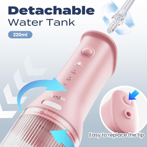 7AM2M Portable Cordless Water Flosser, Oral Irrigator with 3 Modes & 2 Tips, Fast Rechargeable, IPX7 Waterproof, Dental Water Flosser for Travel and Home Use (Pink)